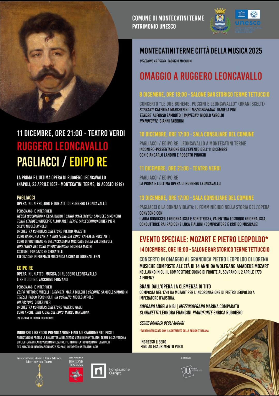 Due opere in versione completa in omaggio a Ruggero Leoncavallo (nella stessa sera); la possibilità di realizzare un prodotto tangibile come il “vecchio” cd; due direttori d’orchestra toscani di fama e carriera internazionale; tre cori provenienti da tre diverse realtà territoriali; location che hanno contribuito a rendere Montecatini famosa ben oltre i confini regionali (Teatro Verdi, Caffè storico delle Terme Tettuccio, sala consiliare del Municipio); ed eventi che - al di là del doppio appuntamento clou con l’opera - vedranno protagonisti concerti, incontri culturali (si parlerà anche di femminicidi nelle opere) e un omaggio al Granduca Pietro Leopoldo. Tutto a ingresso libero e raccolto all’interno della rassegna “Montecatini Terme Città della musica”, in svolgimento dall’8 al 14 dicembre (con brindisi finale degli auguri), un evento promosso e finanziato dal Comune di Montecatini Terme, la cui organizzazione è stata affidata all’associazione “Amici della musica di Montecatini Terme”, con il sostegno di Fondazione Caript e il patrocinio della Regione Toscana.