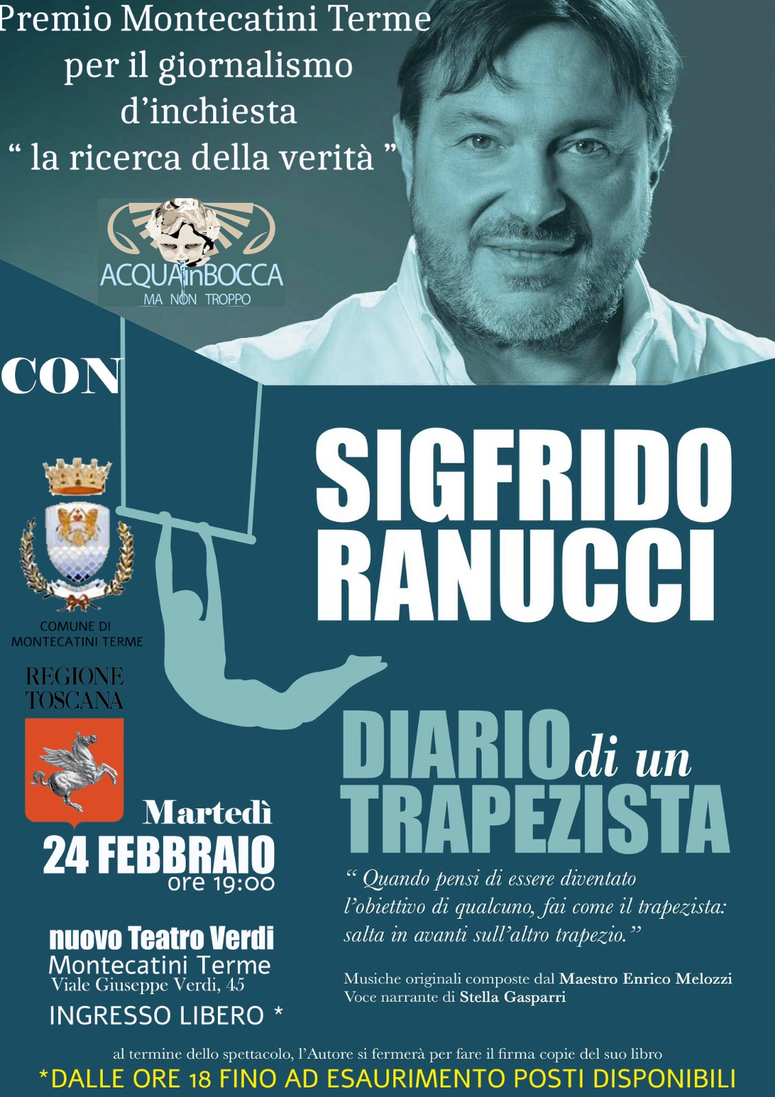 Sigfrido Ranucci, giornalista d'inchiesta presenterà lo spettacolo "Diario di un trapezista", che racconta un Sigfrido segreto, parallelo a quello che siamo abituati a vedere in onda. Un reporter che per realizzare le sue inchieste ha dovuto fare delle scelte repentine che talvolta hanno condizionato per sempre la sua vita.